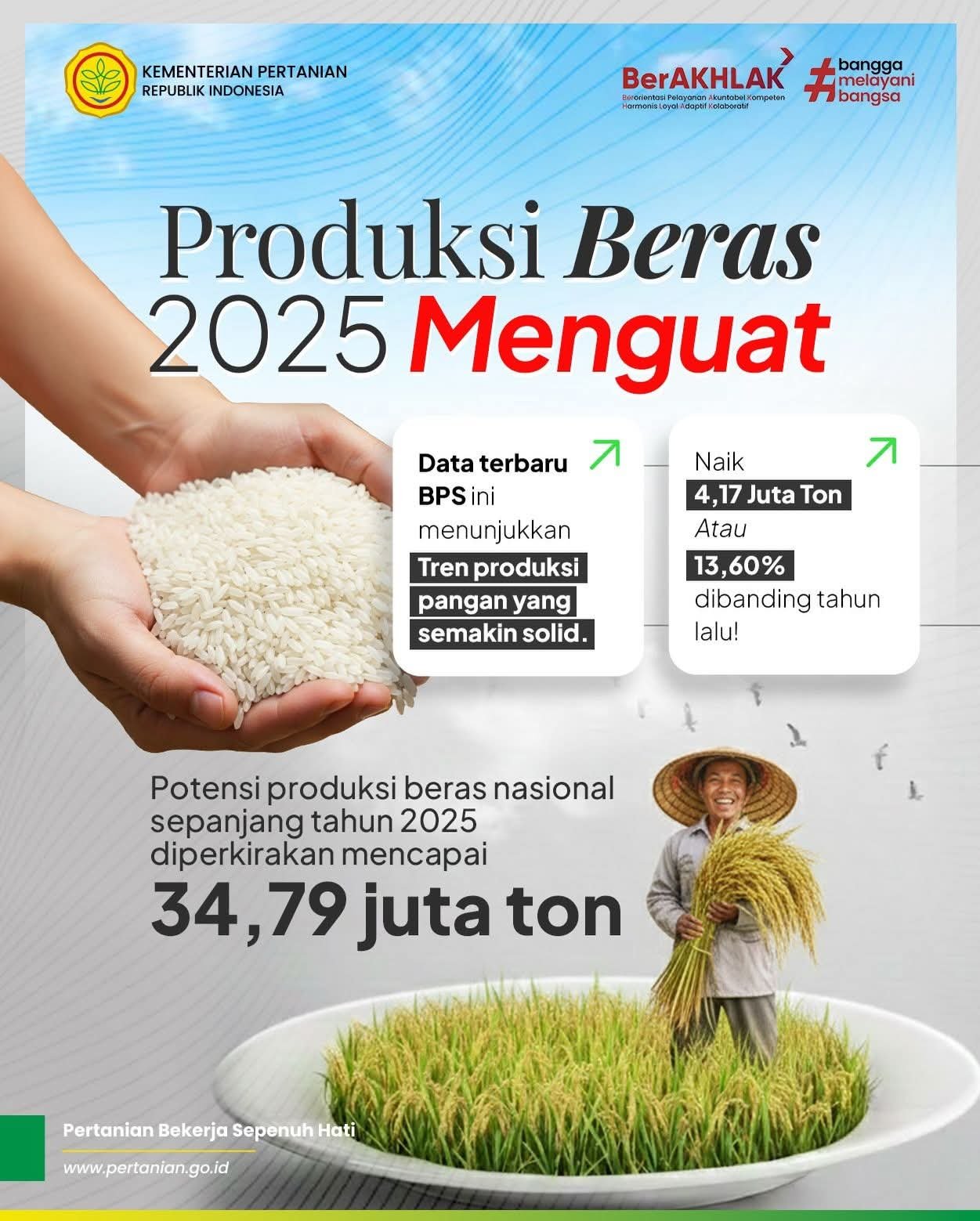 Jakarta,Suarapagi.my.id – Produksi beras nasional pada tahun 2025 diprediksi semakin kokoh. Badan Pusat Statistik (BPS) mencatat potensi produksi beras tahun ini mencapai 34,79 juta ton, atau me...