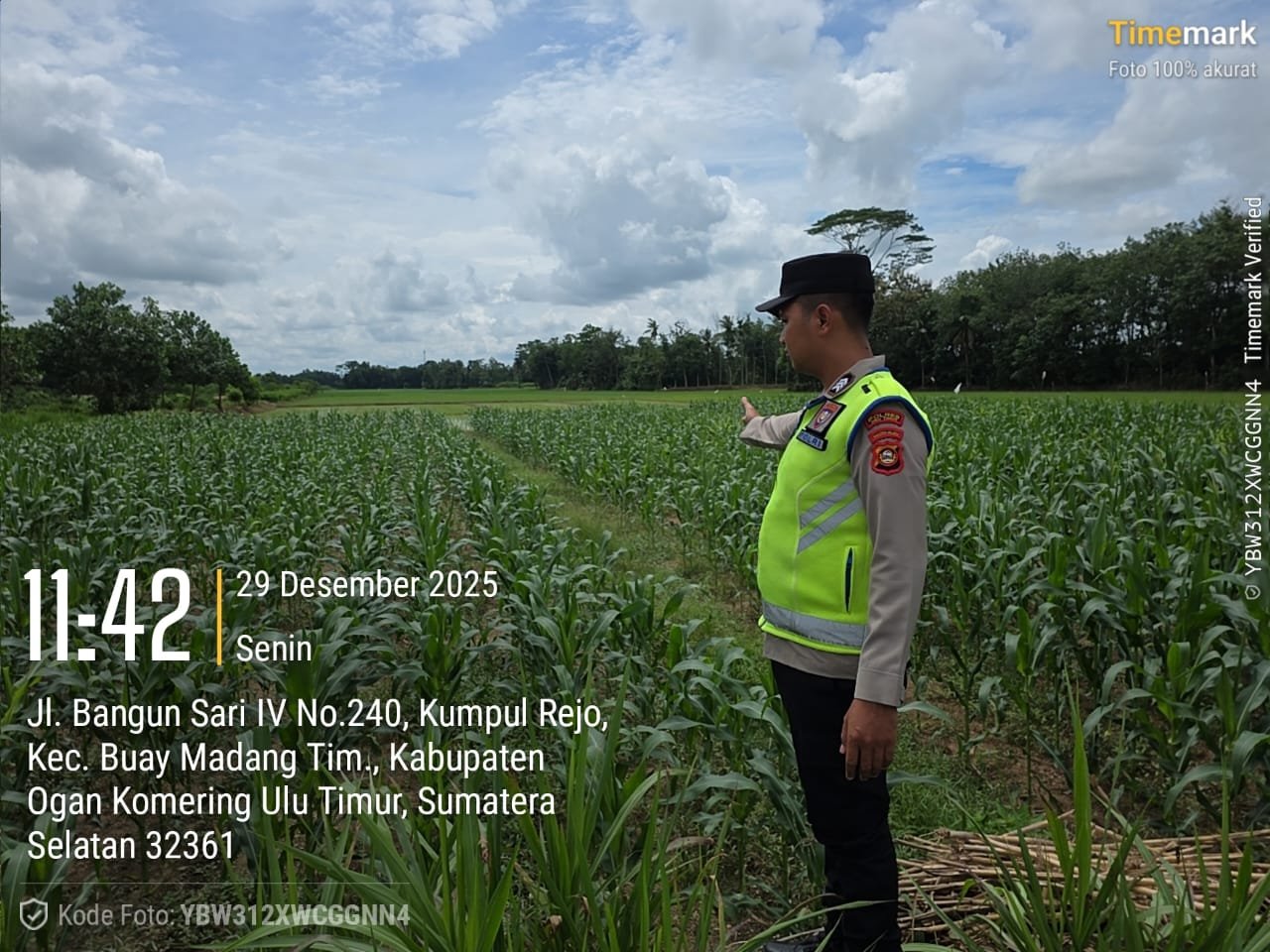 OKU TIMUR – Suarapagi.my.id – Dalam rangka mendukung program ketahanan pangan nasional, Bhabinkamtibmas Polsek Buay Madang Timur terus aktif melakukan pendampingan dan monitoring di wilayah binaannya. Pada Senin (29/12/2025), Bhabinkamtibmas Brigpol Iswanto, S.H., melaksanakan pengecekan perkembangan dan pertumbuhan tanaman jagung milik warga di Desa Kumpul Rejo, Kecamatan Buay Madang Timur, Kabupaten OKU Timur.