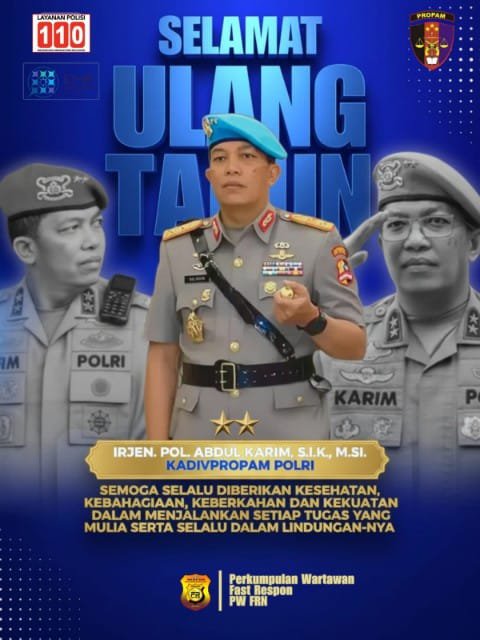 Jakarta, Suarapagi.my.id – Ketua Umum Perkumpulan Wartawan Fast Respon (PW FRN), Agus Flores, menyampaikan ucapan selamat ulang tahun kepada Abdul Karim yang saat ini menjabat sebagai Kepala Divisi Profesi dan Pengamanan (Kadivpropam) Polri.