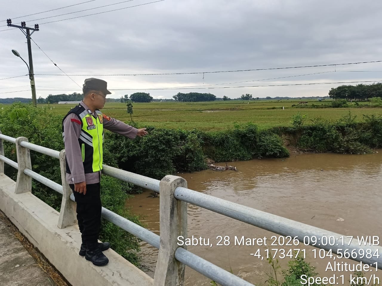 OKU Timur – Suarapagi. My. Id – Guna mengantisipasi potensi bencana alam akibat meningkatnya intensitas curah hujan, jajaran Polsek Buay Madang Timur melaksanakan kegiatan monitoring debit air Sungai Macak di Desa Kedu, Kecamatan Buay Madang Timur, Kabupaten OKU Timur, Sabtu (28/3/2026).
