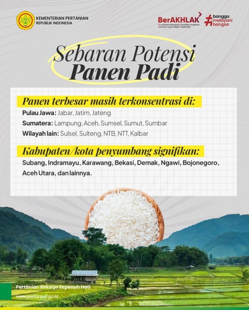 Jakarta,Suarapagi.my.id – Produksi beras nasional pada tahun 2025 diprediksi semakin kokoh. Badan Pusat Statistik (BPS) mencatat potensi produksi beras tahun ini mencapai 34,79 juta ton, atau meningkat 13,60 persen dibandingkan tahun 2024. Capaian ini menjadi sinyal positif bagi stabilitas pangan nasional di tengah berbagai tantangan global.